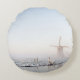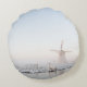 Rundes Wurfskissen einer Windmühle im Schnee nahe bei einem Kanal während eines nebeligen Sonnenaufgangs im Winter in den Niederlanden