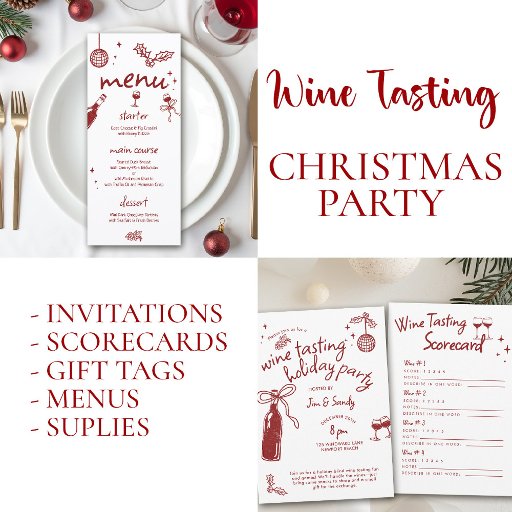 Host a festive and fun holiday wine tasting party with this hand-drawn doodle invitation, complete with whimsical wine glass, bottle, and grape illustrations. The back includes a 4-wine scorecard for an interactive blind tasting game — perfect for Friendsmas, Christmas parties, wine club gatherings, or cozy nights with friends. Customize all text to fit your event. A creative choice for holiday wine nights, charcuterie parties, and secret Santa get-togethers.