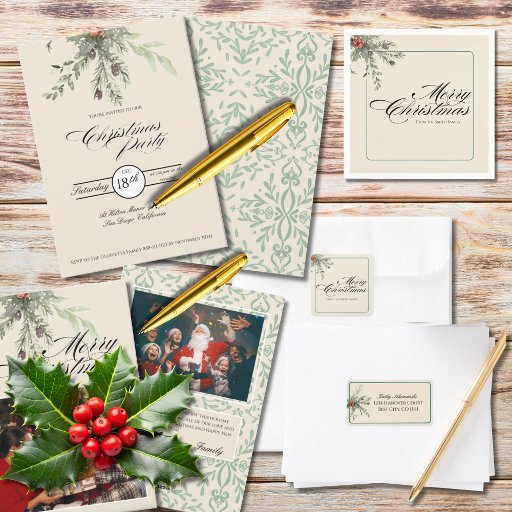 watercolor christmas party invitation, holiday party invitation, holly, pine, pine cones, french christmas cards, toile+christmas card, toile christmas party invitation