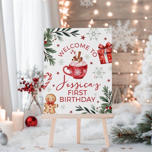 A festive winter birthday thank you card featuring a red cocoa mug with whipped cream and cinnamon, candy canes, snowflakes, pine greenery, and a holiday gift illustration. Designed in a warm Christmas-inspired palette, this card is perfect for winter or holiday birthday celebrations. Includes space for a personalized message of gratitude and works well for children’s seasonal parties and first birthdays.