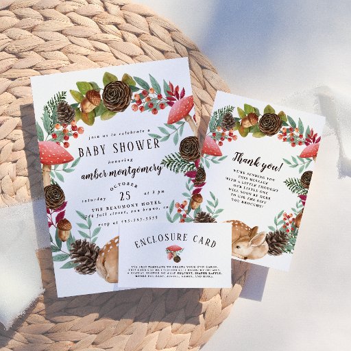 Dieses charmante Design besticht durch einen handbemalten Kranz mit grünen Blätter, Kiefernzapfen, Eicheln, Winterbeeren, Pilzen und vielem mehr! Am unteren Ende des Kranzes befindet sich ein süßer Hirsch, der in einem Ball eingewickelt ist. Bearbeiten Sie den Text in den Vorlagenfeldern, um die Duschtypografie anzupassen.