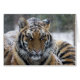 Ein schneebedeckter Tiger blickt in die Ferne.