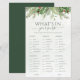 Lassen Sie Ihre Gäste lachen und konkurrieren mit diesem lustigen und interaktiven Brautparty "What's in Your Purse". Dieses Spiel mit einem zauberhaften Winterwunder-Design mit Kiefernästen und Beeren wird die Spieler herausfordern, ihre Geldbörsen nach gängigen Gegenständen zu durchsuchen und Punkte für jedes Spiel zu sammeln. Es ist eine leichtsinnige und einnehmende Aktivität, die Ihrer Feier eine Touch von Aufregung und Lachen hinzufügen wird.