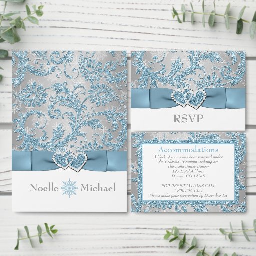 Set den Ton für Ihre Weihnachts- oder Winterhochzeit mit dieser preiswerten, aber luxuriös eleganten Eisblauen, silbergrauen IMITAT Glitzer Damask Muster Hochzeitseinladung, die einen Hintergrund aus verschiedenen weißen Schneeflocken darauf hat und ein bedrucktes Stahlband und Bogen mit einem Paar Diamantschmuck und IMITAT blauer Glitzer verbindet Herzen. Es wäre perfekt für ein winterliches Wunder-Thema oder für eine Weihnachts- oder Silvesterhochzeit. ***BITTE BEACHTEN SIE, dass auf dieser Einladung keine erhöhten Elemente enthalten sind. Alles ist flach gedruckt. ***BITTE BEACHTEN SIE, dass, wenn Sie die Schriftart oder die Größe der Schriftart ändern, es die Art und Weise ändern kann, wie Ihre Einladung gedruckt wird. Es druckt die Art, wie Sie es auf Ihrem Monitor sehen. Wenn Sie Alignment-Probleme oder Größenprobleme haben, wenden Sie sich bitte an mich, um Hilfe zu erhalten, BEVOR Sie bestellen. Ich werde Ihre Einladung nicht sehen, wenn Sie sie bestellen, und Zazzle wird nichts bearbeiten (Tippfehler, Ausrichtung, etc.). Wenn Sie Hilfe benötigen oder andere passende Objekte oder eine andere Farbkombination wünschen, senden Sie Ihre Anfrage bitte an niteowlstudio@gmail.com.