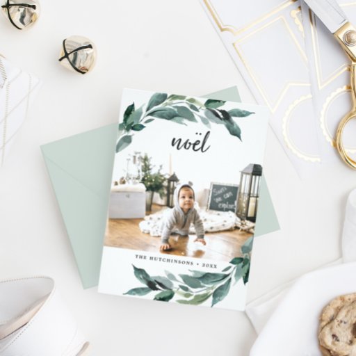 Freuen Sie sich auf die modernen und eleganten, gefalteten Weihnachtskarten mit Ihrem Lieblings-Foto, das mit üppigen Winterbotanicals in grüner Aquarellfarben besticht. Der französische Weihnachtsgrüß "Joyeux Weihnachten" erscheint oben in handgezeichneten Schriftzeichen mit Ihren Namen und das Jahr am unteren Ende. Das Innere wird durch drei zusätzliche Fotos und eine individuell vorgedruckte Nachricht mit dem passenden grünen Wasserfarbengrün ergänzt.
