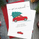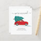 Wir haben Moved Christmas Holiday Moving Announcement mit einem roten Auto und Weihnachtsbaum mit Skript und populäre Typografie auf weißem Hintergrund.