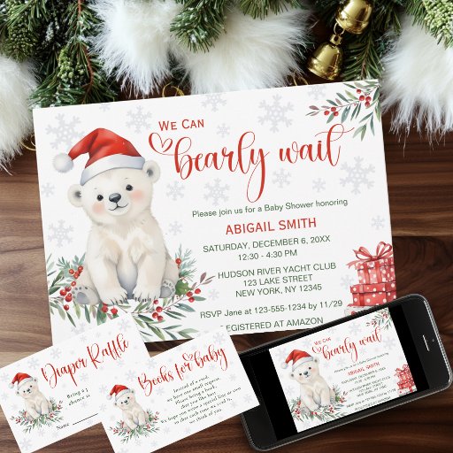 Feiern Sie die bevorstehende Ankunft Ihres Kleinen mit unserer charmanten Einladung "We Can Bearly Wait" Weihnachtsdusche. Dieses Design mit einem zauberhaften Eisbär in festlicher Winterlandschaft verbindet Urlaubsjubiläum mit süßer Vorfreude. Ideal für den Dezember oder Winter Babyduschen, ist es eine herzliche Wahl für Familie und Freunde zu feiern. Persönlich mit Ihren Duschdetails für eine würdige Einladung.