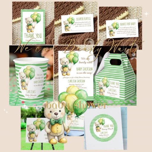 Wir können frühzeitig warten niedlicher Teddybär mit Ballons geschlechtsneutrale Babydusche personalisierte monogramm gedruckte Papiervorlage, niedlicher Teddy mit gelben und grünen Ballons Babydusche personalisierte Tischdekoration gedruckte Teller