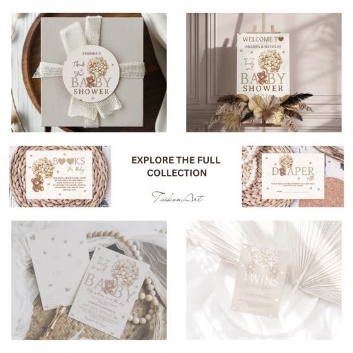 Schöne beige hellbraune Babydusche Einladung! Niedlicher Teddybär, eingebettet in zartes Beige- und Elfenbeingold, umgeben von einer traumhaften Kulisse von hellbraunen, Aquarellfarben und 🧸, ist der ideale Set für Ihre minimalistische böhmische Affäre! ✨ Vergessen Sie nicht, die komplette Sammlung zu entdecken.