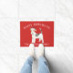 Adorable Weihnachtsmatte mit einem Wire Hair Fox Terrier Hund, der eine Weihnachtsmannmütze auf festlichem rotem Hintergrund trägt.