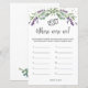 Wo waren wir Brautparty Game - Eucalyptus Foliage Lila Lavendel Blume Brautparty | Paare Foto Game. Der Text "Wo waren wir" ist in einem Skript-Schriftart geschrieben. Oben auf der Karte - goldene und grüne Effekt Konfetti (ihre Bilder können entfernt werden).