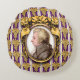 Das Originalwerk von ZoeSPEAK auf diesem Rundkissen zeigt ein Portrait des klassischen Komponisten Wolfgang Amadeus Mozart. Das Portrait ist ein Profil Set in einem verzierten ovalen goldenen Rahmen. Der Rahmen hängt auf einem lila Hintergrund mit goldenen Traubenbäumen in Reihen und senkrechten Streifen aus Weiß und Lavendel.