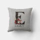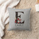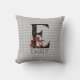 Whimsical Wonderland themed throw pillow bietet Vintage Alice und die Queen of Hearts Zeichenfarbabbildungen mit großem Buchstaben / initiales E mit einer Schwarz/Gold/Rot-Karte-Suiten füllen Muster auf einem Vintagen grauen harlequin Hintergrund. Weitere Personalisierung mit benutzerdefinierbarem Namenstext