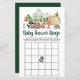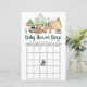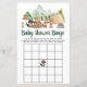 Niedliches rustikales Bingospiel mit einer Darstellung von Waldtieren (Bär, Fuchs und Waschbär) mit Zelt- und Lagerfeuer-Camping in den Bergen und Wäldern und "Baby Shower Bingo" in einer dunkelgrünen Schrift für Jäger.