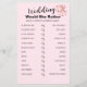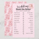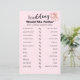 Fügen Sie Ihrem Brautparty, Ihrem Junggeselinnen-Abschied oder Ihrer Hochzeitsfeier Aufregung und Lachen hinzu mit diesem Hochzeitsspiel "Würde sie lieber sein?"! Die Gäste werden die Vorlieben der Braut schätzen - Liebe sie Strandbäder oder glanzt, schokolade oder Vanille, bleibe Zuhause oder tanzt bis zum Morgengrauen? Dieses Spiel ist mit einem spielerischen rosa und roten Layout mit eleganten Verlobung-Ring-Akzenten gestaltet und eignet sich hervorragend für Party, Paarduschen und Hochzeitsfeiern. Ein Muss, um vor dem großen Tag lustige Erinnerungen zu schaffen! Individuell anpassbar - fügen Sie Ihren persönlichen Spin für Ihre kommende Veranstaltung hinzu! 📌 Perfekt für: ✔️ Hochzeitsempfang & Cocktail-Stunden ✔️ Brautparty & Junggeselinnen-Abschiede ✔️ Engagement Parties & Probe Dinners ✔️ Gasttisch-Aktivitäten & Icebreak-🎉 Vollendung der Kollektion! Pair diese Hochzeitswortsuche mit unseren anderen passenden Hochzeitsspielen für ein zusammenhängendes und stilvolles Eventerlebnis.