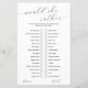 Fügen Sie Ihrem Brautparty eine Touch von Eleganz und Spaß mit unserem ausgeklügelten "Würde Sie lieber"-Spiel hinzu. Dieses minimalistische Design besticht durch eine saubere Schwarz-Weiß-Ästhetik mit romantischen Schriftzeichen, die sich perfekt für eine moderne und schicke Feier eignet. Mit spielerischen Fragen und einem einfachen Format wird dieses Spiel sicher Lachen und Gespräch unter Ihren Gästen auslösen, während sie versuchen, die Vorlieben der Braut zu erraten. Erschaffen Sie unvergessliche Erinnerungen mit diesem stilvollen und ansprechenden Brautparty.