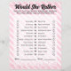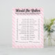 Mit unserer "Würden Sie lieber Spaß und Lachen" zu Ihrer Feier bringen? Geburtstagsspiel! Diese unterhaltsame Aktivität fordert die Gäste auf, zu erraten, was das Geburtstagsmädchen in verschiedenen Szenarien vorziehen würde. Von der Wahl zwischen Schlaf im späten oder frühen Aufstehen, bis zur Pizza Pizza Pepperoni über Käsepizza, dieses Spiel wird sicher Gesprächen und Lachen auslösen. Die Person mit den korrektesten Antworten gewinnt! Das stilvolle Design mit rosa Streifen und Glitzer-Akzenten ergänzt Ihr Party perfekt. Außerdem sind alle Optionen vollständig anpassbar, um das Spiel einzigartig für das Geburtstagsmädchen zu machen. Ideal für Geburtstage, Duschen und andere festliche Ansammlungen, behalte dieses Spiel Ihren Gästen verlobt und schafft unvergessliche Momente. Für passende Produkte, Karo aus der gesamten Kollektion unten.