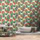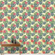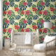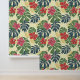 A cheerful red and pink floral pattern with large green and blue monstera leaves against a soft yellow background.