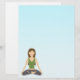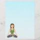 Stilvolle Vektor-Illustration einer schönen brünetten Frau, die Yoga macht. Die Frau sitzt in traditioneller Lotus-Position. Sie trägt ein grünes Panzeroberteil und eine dunkelgraue Hose. Der Hintergrund ist ein schöner blauer Verlauf.