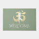 Yoga Studio Meditation Instructor / Life Coach / Healer / Reiki Master / Massage Therapy Willkommen Doormat Vorlagen - Moderne Yoga Meditation Pose / Tree Pose (Vrksansana) und Imitate Gold Foil OM Symbol auf grünem Farbhintergrund.