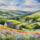 Yorkshire Meadowsong. Landschaft Yorkshire Dales. Diese stilvolle Aquarellbild des Yorkshire Dales strahlt Ruhe aus, mit sanften Hügeln und Feldern, die von Steinmauern umgeben sind. Steinhäuser umsäumen die Landschaft, und lebendige Wiesen-Blume bieten einen farbenfrohen Kontrast und verkörpern den friedlichen, entspannten Geist der Landschaft.
