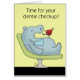 Ein lustiges Bild für eine Erinnerung-Karte für Zahnarztbüros. Ein großer Nilpferd sitzt in einem Zahnstuhl mit einem weit geöffneten Mund, während ein kleiner Vogel auf seinem Bauch steht und einen Zahnspiegel hält, der bereit ist, eine Untersuchung durchzuführen. In der Unterschrift steht: "Zeit für die Zahnuntersuchung!" Originelles Design von Christie Black von Kreationen aus dem Herzen.