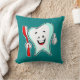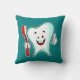 Ein Kissen mit einer Abbildung eines großen weißen Cartoon, der mit einem roten Zahnbürste und dem Vorzeichen des Daumen nach oben lächelt.