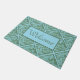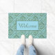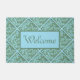 Hübsche Blattmatte in Grün und Hellblau. Das ist ein zartes, hintergrundliegendes Blatt-Design. Der Hintergrund ist blattgrün und die Blätter sind himmelblau. In der Mitte befindet sich ein Rechteck mit Willkommen in einem kurvenreichen französischen Schriftart. Aber man kann das ändern, um zu sagen, was man will. Dieses Druckdesign stammt aus einem originalen Fliesenmuster des Oregon Kachelmachers Fay Jones Day.