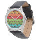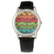 Diese Uhr hat ein Design von Zickzacklinien in den 70er Jahren in Gelb, Orange, Rot, Grün und Blau auf einem braunen Feld.