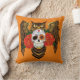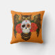 Eine braune große Hornkeule mit einem Tag des toten Zuckerschädels und rote Rosen in einem Hintergrund von Orange.