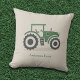 Ein hellbeige Kissen mit einer Abbildung eines grünen und grauen Bauerntraktors im Cartoon-Stil und einem anpassbaren Text unten! Es könnte ein perfektes Geschenk für einen Bauer oder eine Landfamilie sein!