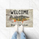 Willkommen auf der Zuhause "Ihr Familienname" oder wechseln Sie in die Hütte. Eine Begrüßungsmatte zum Thema Angeln für die Familie, die Lieben zum Fischen. Das Design umfasst einen riesigen Pfauenbarsch und einen rustikalen Hintergrund.
