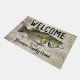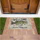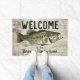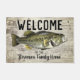 Willkommen auf der Zuhause "Ihr Familienname" oder wechseln Sie zur Hütte. Eine Begrüßungsmatte zum Thema Angeln für die Familie, die Lieben zum Fischen. Das Design ist mit einem lunker largemouth Bass ausgestattet.