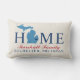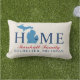 Stilvolles Begrüßungskissen mit "Zuhause"-Text mit Michigan-Staat-Karte und individuellem Text, der mit Ihrem Familiennamen und der Stadt, dem Staat, in dem Sie leben, personalisiert werden kann. Die navy blauen Herz-Stadt Marker können über Customized an den entsprechenden Ort verschoben werden. Horizontale Streifen ziehen die Rückseite an. Navy, Blau, Rot und Weiß.