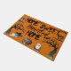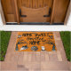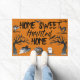 Fügen Sie Ihrer Haustür mit dieser Zuhause Sweet Spuk Zuhause-Doormat eine sprichwörtliche Touch hinzu, die mit gruseligen schwarzen Schriftzeichen und Halloween-Illustrationen von beängstigenden Bäumen, Fledermäusen, einer Jack-o-Laterne, einem Geist und einer schwarzen Katze Set vor einem orangefarbenen Hintergrund zeigt.
