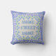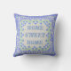 Ein sehr hübsches Quadrat-Kissen oder Kissen, mit "Zuhause, Sweet Zuhause" in Vintager Schrift und einem Randmuster von Blue Periwinkle Blume und Grüne Blätter, auf einem Imitat Linenhintergrund. Als Teil der Posh und Painterly 'Periwinkle Patch' Kollektion kann dieses Muster leicht an jedes Square Kissen oder Kissen angepasst werden.