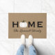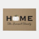 Herzlich willkommen auf Ihrer Zuhause in diesem Herbst mit einer einladenden personalisierten Türmatte. Das schlichte und stilvolle Typografie-Design beinhaltet den "Zuhause"-Text mit elegantem, individuellem Skripttext für Ihren Familiennamen und einen Kürbisakzent der Weißernte. Enthält ein neutrales Bräunungsschema, Schwarz, Weiß und Grün.
