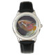 Das Originalfoto von ZoeSPEAK auf dieser Uhr zeigt einen Zwerg Gouramafisch, der in einem Aquarium schwimmt. Dieser farbenfrohe tropische Fisch hat einen orangefarbenen Körper mit vertikalen Streifen, die in der Sonne strahlend hellblau aussehen. Grüne Blätter einer Unterwasser-Pflanze sind in einer Ecke des Fotos zu sehen, in einem großen Muschel in einer anderen Ecke hinter dem Fisch, und der Hintergrund ist ein strukturiertes Medium grau.