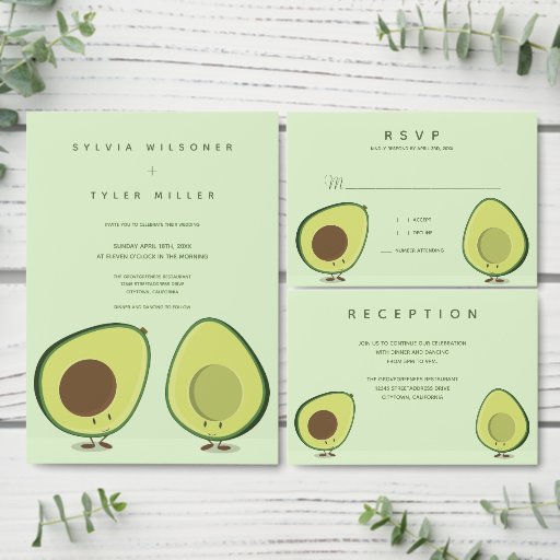 Eine Feinschmecker Hochzeit mit einer Touch Spaß einladen. Lassen Sie sich von zwei glücklichen Avocado-Illustrationen vertreten, die tief in der Liebe sind. Diese Einladung vermischt skurrile Freude mit genügend Eleganz, damit Sie Ihre Hochzeit so gestalten können, wie Sie möchten. Die Einladung erfolgt in Grün-Tönen. Platzieren Sie Ihre Namen und Informationen auf dieser Einladung, fügen Sie sie in Ihren Warenkorb, und haben Sie eine wunderbare Hochzeit.