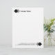 Ein Business-Letterhead-Template-Design mit einem zweifarbigen, doppelquadratischen oder rautenförmigen Dekormotiv, das in der oben verlassen Ecke, 1/2 Zoll von den Kanten des Papiers entfernt, sowie in der unteren rechten Ecke, wo das Motiv gedreht wird, um die Töne umzukehren. Firmenname ausgerichtet neben dem oberen Motiv mit E-Mail, Web, Adresse und Telefondaten, die am unteren Motiv ausgerichtet sind. Dieses einfache, aber attraktive berufliche Design lässt sich auf viele Arten anpassen.